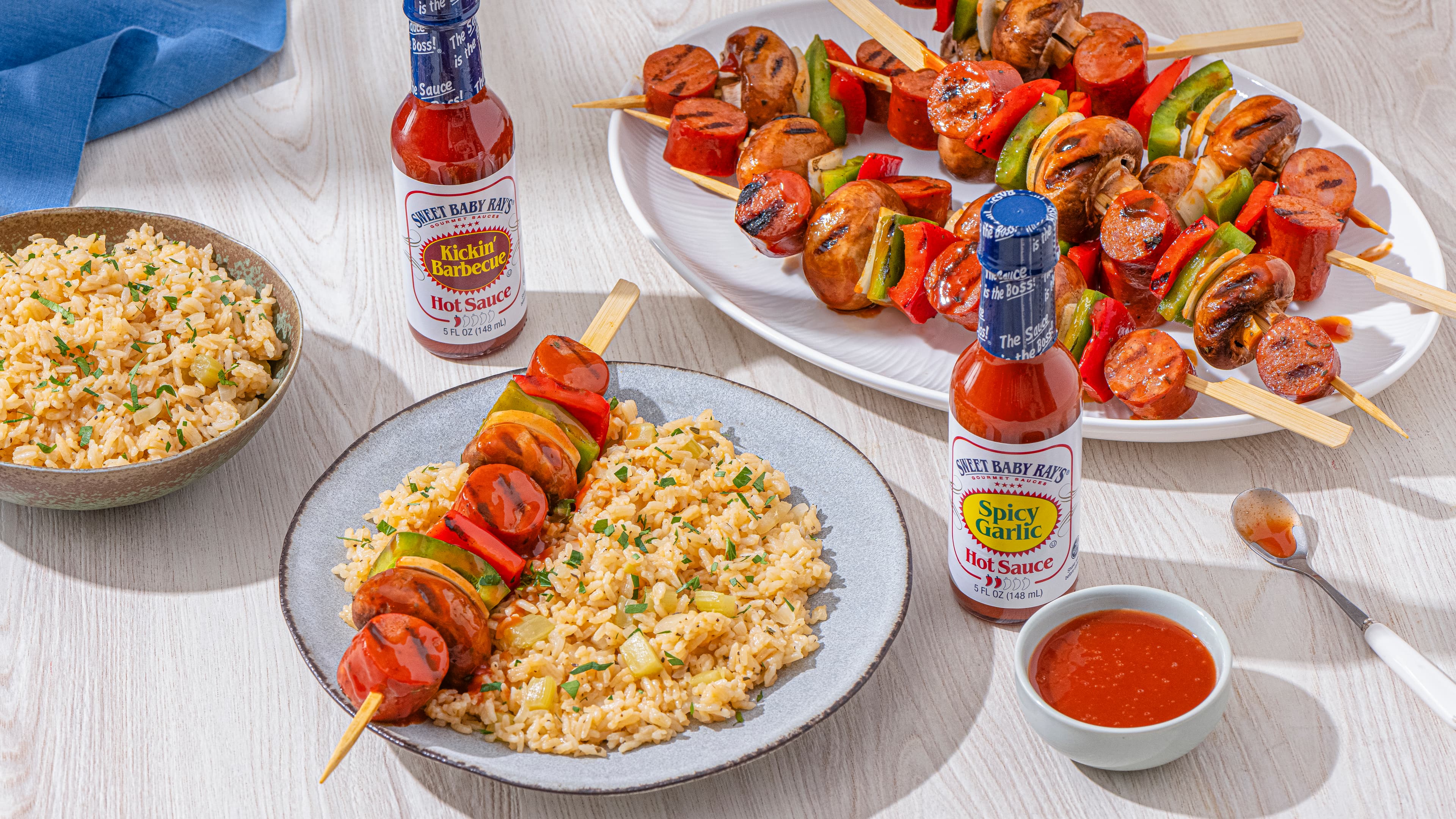 - Grill kebabs, turning occasionally, for 10 to 12 minutes or until grill marked. Brush with Sweet Baby Ray’s Kickin’ Barbecue. Grill, turning occasionally, for 6 to 8 minutes or until barbecue sauce starts to caramelize.